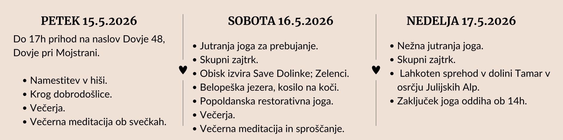 Tri dni sprostitve, joge, meditacije in nežnih pohodov v objemu Julijskih Alp.